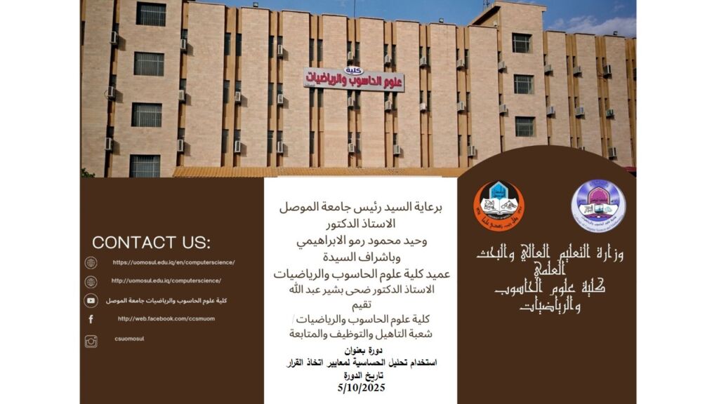 برعاية واشراف السيدة عميد كلية علوم الحاسوب والرياضيات الأستاذ الدكتور ضحى بشير عبدالله المحترمة وضمن سلسلة النشاطات العلمية للكلية, تقيم الكلية بالتعاون مع وحدة شؤون المرأة ورشة تدريبية بعنوان “دور الاحصاء في تنظيم ادارة الوقت وحل مشكلات اتخاذالقرار” يوم الاحد 5-10-2025 .
