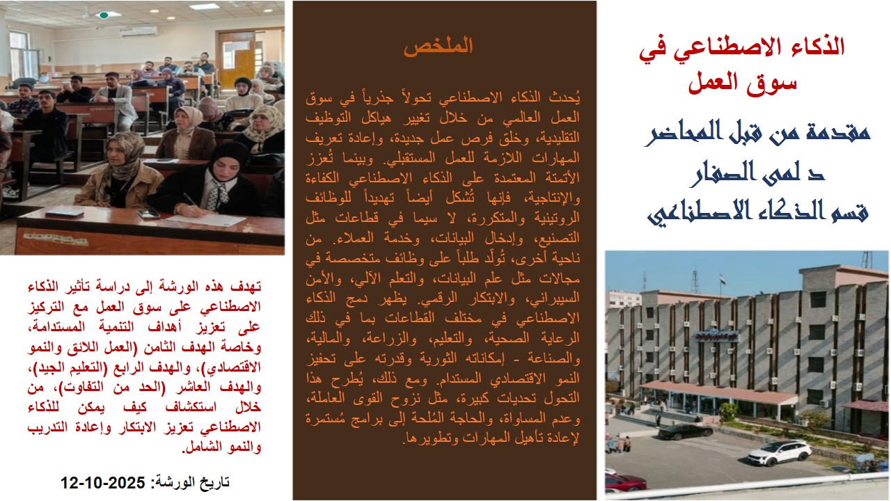برعاية واشراف السيدة عميد كلية علوم الحاسوب والرياضيات الأستاذ الدكتور ضحى بشير عبدالله المحترمة وضمن سلسلة النشاطات العلمية للكلية, تقيم الكلية/ شعبة التاهيل والتوظيف والمتابعة ورشة بعنوان “الذكاء الاصطناعي في سوق العمل” ابتداءا من يوم الاحد 12-10-2025 .