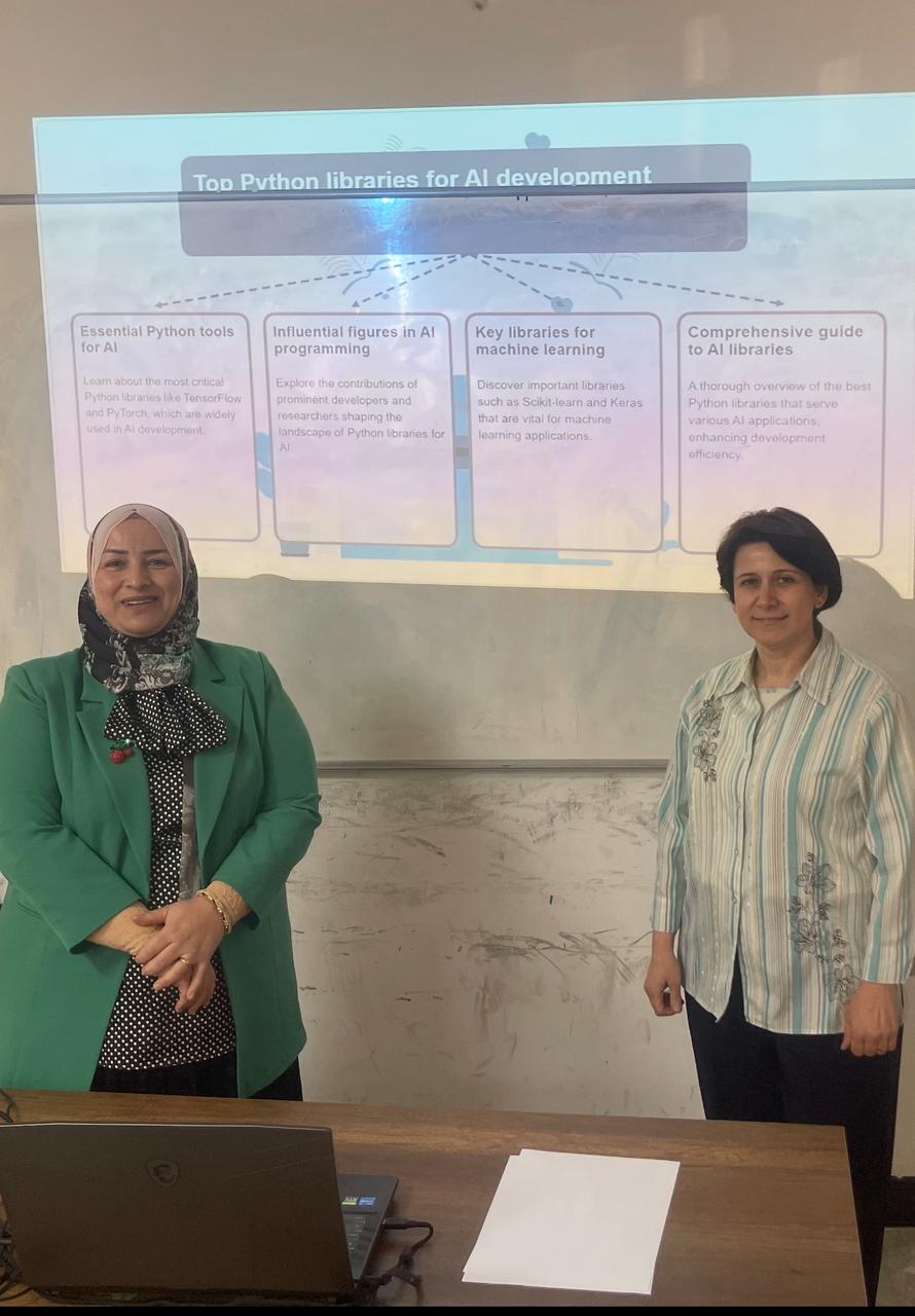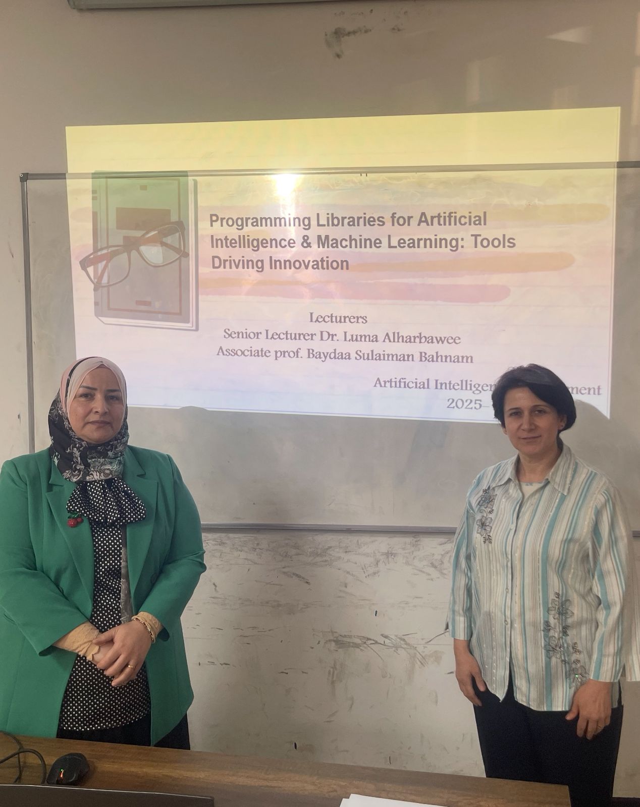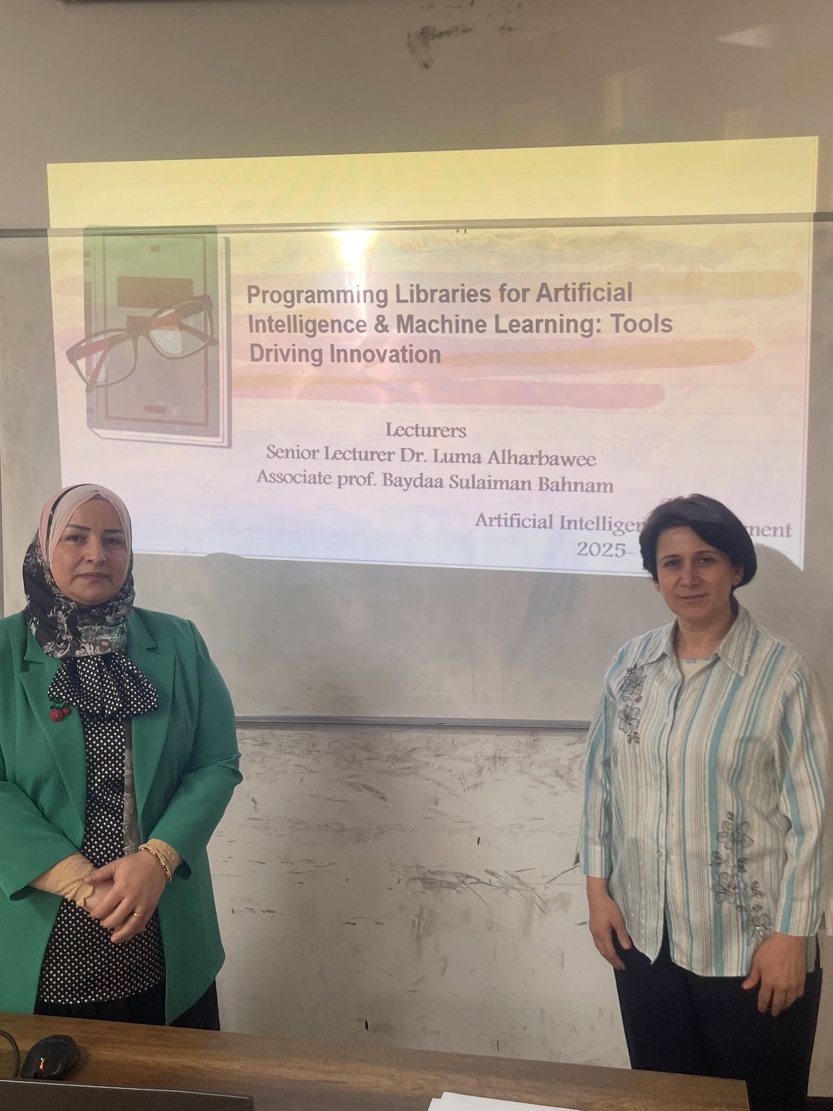 برعاية واشراف السيدة عميد كلية علوم الحاسوب والرياضيات الأستاذ الدكتور ضحى بشير عبدالله المحترمة وضمن سلسلة النشاطات العلمية للكلية, اقامت الكلية دورة تعليم مستمر “Programming Libraries for AI & Machine Learning” ابتداءا من يوم الاحد 5-10-2025 القتها كل من م.د لمى اكرم عبدالله و أ.م بيداء سليمان بهنام