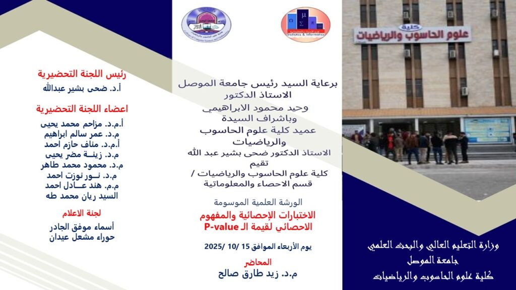 برعاية واشراف السيدة عميد كلية علوم الحاسوب والرياضيات الأستاذ الدكتور ضحى بشير عبدالله المحترمة وضمن سلسلة النشاطات العلمية للكلية, اقامت الكلية سلسلة من دورات التعليم المستمر للعام الدراسي 2025-2026 من ضمنها دورة تعليم مستمر “Analytics of Big Data” ابتداءا من يوم الاربعاء 1-10-2025 القتها كل من د. نغم عجيل سلطان و م. ظفر سامي حمادي