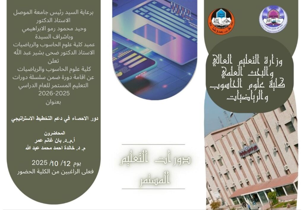 برعاية واشراف السيدة عميد كلية علوم الحاسوب والرياضيات الأستاذ الدكتور ضحى بشير عبدالله المحترمة وضمن سلسلة النشاطات العلمية للكلية, اقامت الكلية سلسلة من دورات التعليم المستمر للعام الدراسي 2025-2026 من ضمنها دورة تعليم مستمر “اساسيات انترنت الأشياء وتطبيقاته” ابتداءا من يوم الاحد 24-9-2025 القاها كل من م.د. عامرة استقلال بدران و م. غادة ذنون يونس
