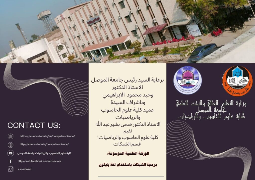 برعاية واشراف السيدة عميد كلية علوم الحاسوب والرياضيات الأستاذ الدكتور ضحى بشير عبدالله المحترمة وضمن سلسلة النشاطات العلمية للكلية, اقامت الكلية سلسلة من دورات التعليم المستمر للعام الدراسي 2025-2026 من ضمنها دورة تعليم مستمر “الذكاء الاصطناعي وتكنولوجية الامن السبراني ” ابتداءا من يوم الاثنين 6-10-2025 القاها كل من أ.م. ميلاد جادر سعيد و م.د. عامرة استقلال بدران
