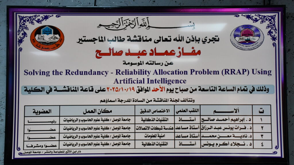 نوقشت في قاعة المناقشة بكلية علوم الحاسوب والرياضيات في جامعة الموصل يوم الاحد بتاريخ 19/10/2025