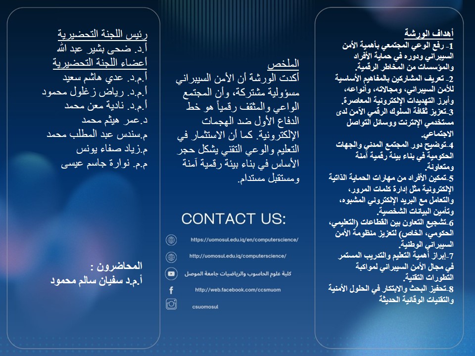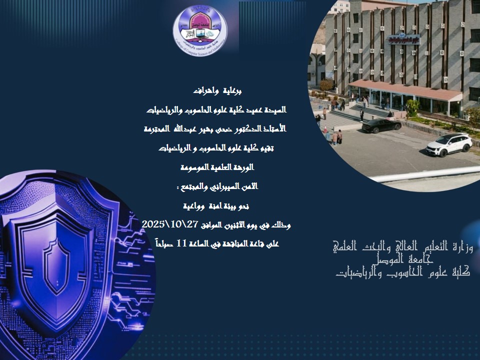 برعاية واشراف السيدة عميد كلية علوم الحاسوب والرياضيات الأستاذ الدكتور ضحى بشير عبدالله المحترمة وضمن سلسلة النشاطات العلمية للكلية , تقيم كلية علوم الحاسوب والرياضيات الورشة العلمية الموسومة “الامن السيبراني والمجتمع : نحو بيئة امنة وواعية” يوم الاثنين 27-10-2025 .