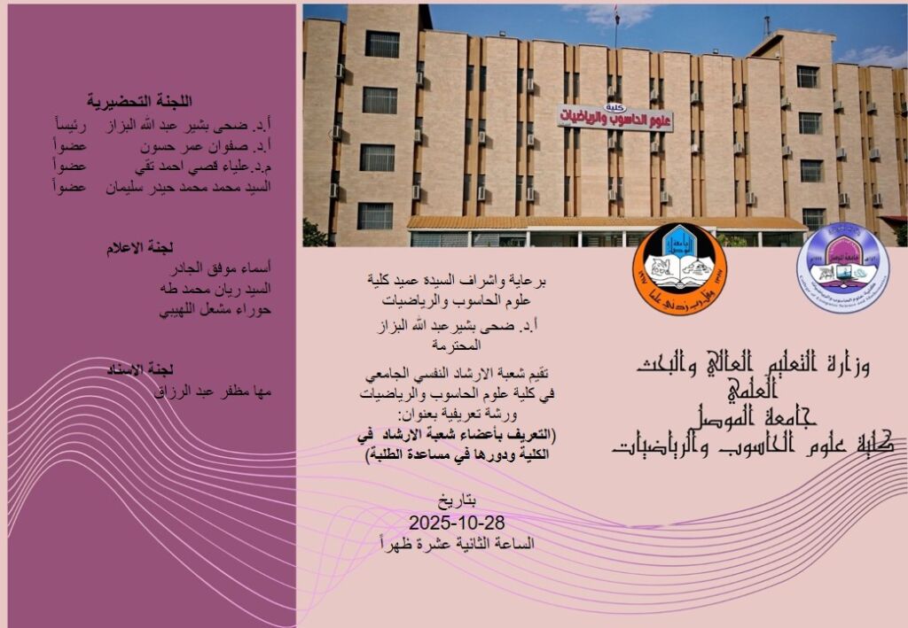 برعاية واشراف السيدة عميد كلية علوم الحاسوب والرياضيات الأستاذ الدكتور ضحى بشير عبدالله المحترمة وضمن سلسلة النشاطات العلمية للكلية , تقيم شعبة الارشاد النفسي الجامعي في كلية علوم الحاسوب والرياضيات ورشة تثقيفية بعنوان: (الحياة الجامعية: التعايش السلمي والاحترام والابتعاد عن اثارة الفتن والتنمر) يوم الثلاثاء 28-10-2025 .