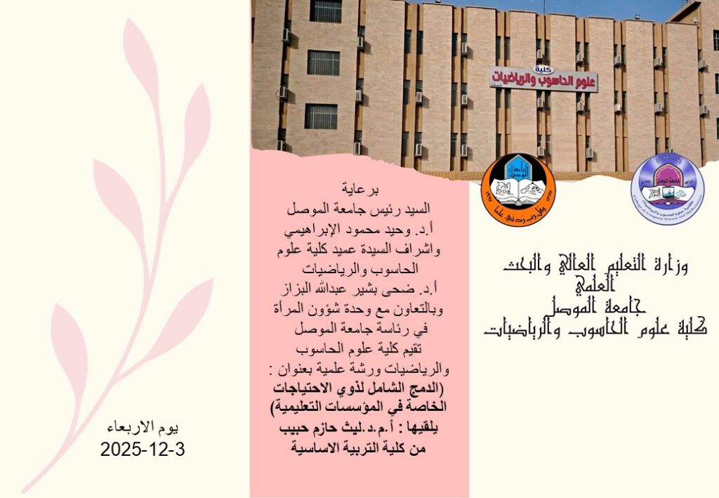 برعاية السيد رئيس جامعة الموصل الاستاذ الدكتور وحيد محمود الابراهيمي وبأشراف السيدة عميد كلية علوم الحاسوب والرياضيات الأستاذ الدكتور ضحى بشيرعبد الله تقيم شعبة الارشاد النفسي الجامعي في كلية علوم الحاسوب والرياضيات الندوة التوعوية .. الارشادية .. التثقيفية الموسومة (صحة وقيم: بناء قدرات الشباب في مواجهة تحديات الانترنيت من الناحية الصحية والتربوية والاخلاقية) يوم الاربعاء 3-12-2025