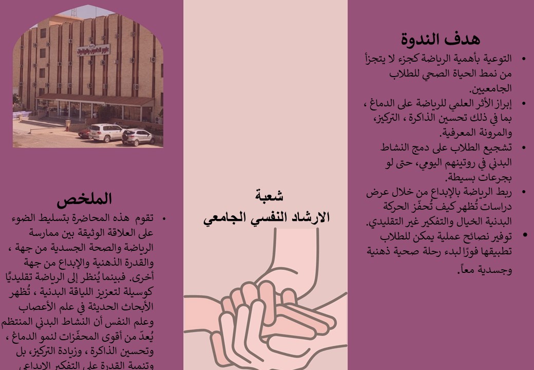 اعلان الندوة التوعوية .. الارشادية .. التثقيفية الموسومة الرياضة: صحة وابداع ذهني
