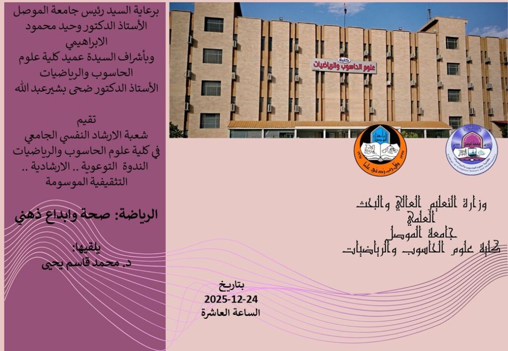 برعاية السيد رئيس جامعة الموصل الأستاذ الدكتور وحيد محمود الإبراهيمي، وبإشراف السيدة عميد كلية علوم الحاسوب والرياضيات الأستاذ الدكتورة ضحى بشير عبد الله البزاز، أقامت كلية علوم الحاسوب والرياضيات، بالتعاون مع قسم الرياضيات وشعبة حقوق الإنسان في جامعة الموصل، جلسة حوارية موسومة «رحلة المرأة نحو الإنصاف: مساواة أم عدالة؟»، وذلك يوم الاثنين الموافق 22 كانون الأول 2025، على قاعة الكلية.