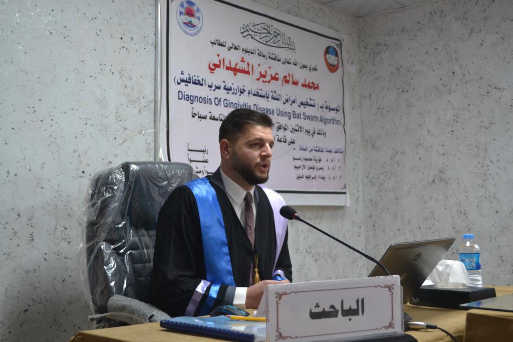 نوقشت في عمادة كلية علوم الحاسوب والرياضيات ، رسالة الدبلوم العالي الموسومة “تشخيص امراض اللثة باستخدام خوارزمية سرب الخفافيش” للطالب (محمد سالم عزيز جواد) قسم الحاسوب واشراف الاستاذة المساعدة الدكتورة (بيداء ابراهيم خليل) .واستخدم في هذه الرسالة احدى الخوارزميات الكلاسيكية وهي خوارزمية تحليل المركبات الاساسية لتقليل ابعاد الصورة وتسهيل عملية التعامل معها اختصارا للوقت فبعد استخلاص الصفات للصورة بطريقة تحليل المركبات الاساسية يتم ادخال الصفات المستخلصة الى خوارزمية سرب الخفافيش لتشخيص صور امراض اللثة الثمانية.
