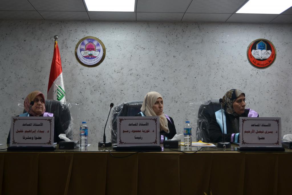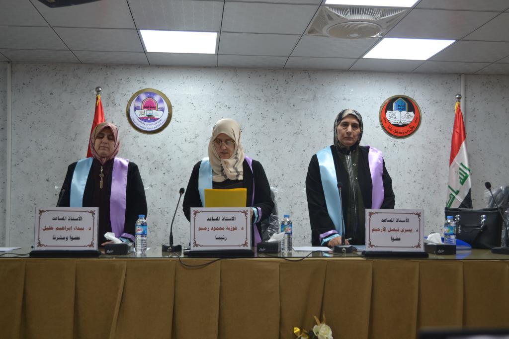وتألفت لجنة المناقشة من الساده المدرجة اسمائهم ادناه :د.فوزية محمود رمو /استاذ مساعد/رئيساد.يسرى فيصل الارحيم /استاذ مساعد /عضواد.بيداء ابراهيم خليل /استاذ /عضوا ومشرفا