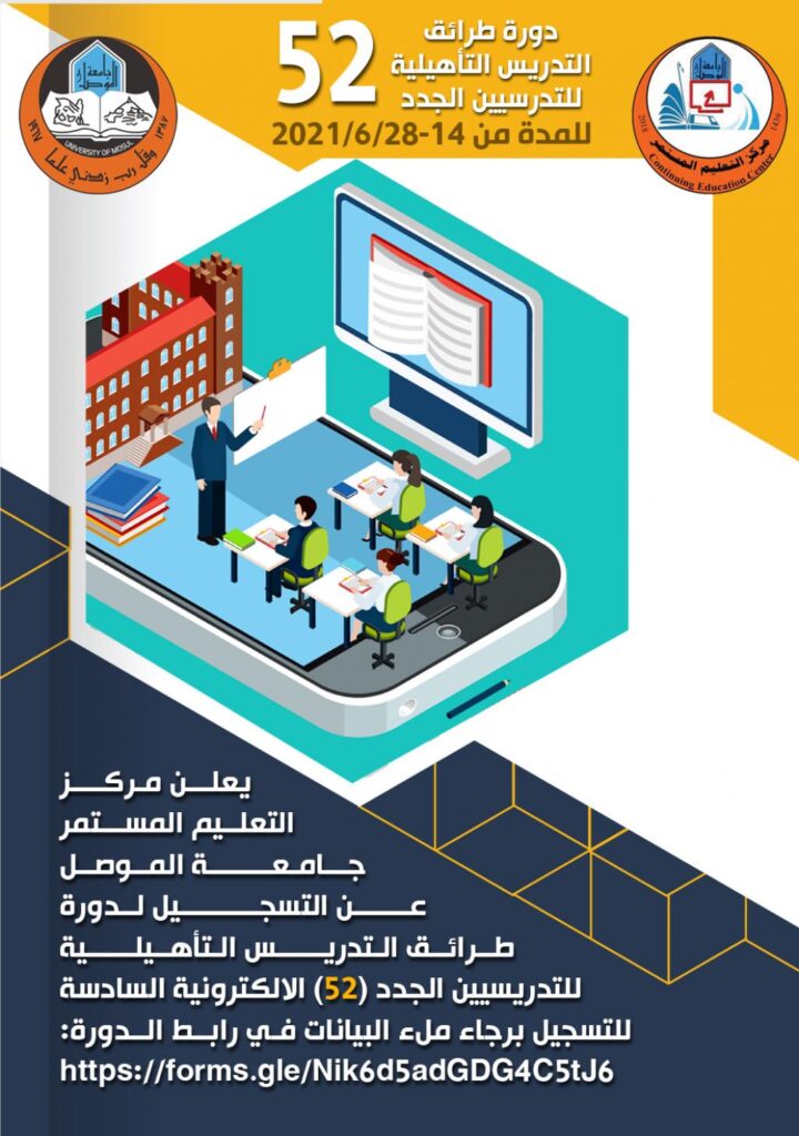 أنهى مركز التعليم المستمر دورة طرائق التدريس التأهيلية (٥١) الالكترونية الخامسة للتدريسيين الجدد والتي أقيمت للفترة من 6/4/2021و لغاية20/4/2021 وبمشاركة(٢٧) مشاركا من تدريسيي جامعة الموصل ومن دائرة صحة نينوى ومن غير المتعينين والحاصلين على شهادة الدراسات العليا (الماجستير والدكتوراه والبورد) وتضمنت الدورة محاضرات تخصصية في المجال التربوي ومنها طرائق التدريس الحديثة والاتصال والتواصل الالكتروني وإدارة الصف ومهارات التدريس والقياس والتقويم فضلا عن دمج مهارات التفكير في التدريس..