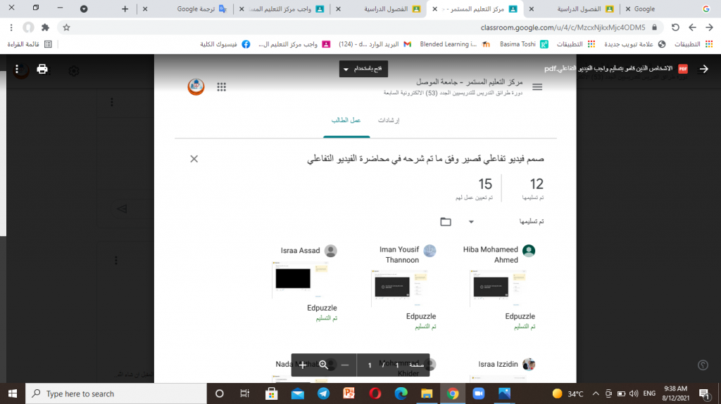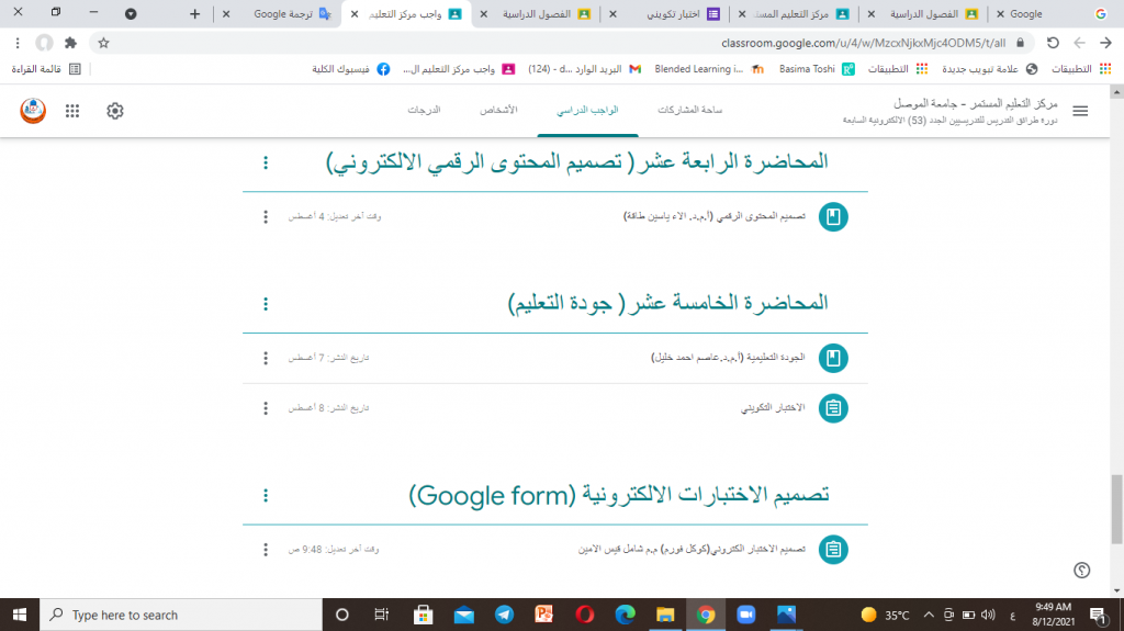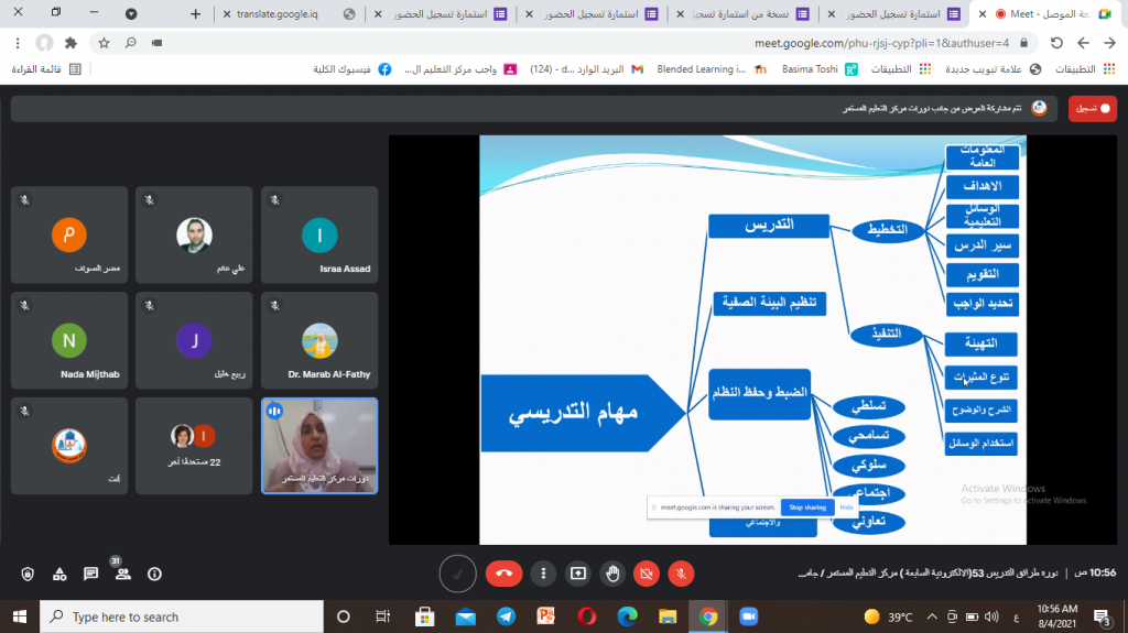 اختممت الدورة 53 “الالكترونية السابعة” لطرائق التدريس التاهيلية والخاصة بالتدريسيين الجدد والتي اقيمت للمدة من 28 تموز 2021 لغاية 11 اب 2021 وبمشاركة (26) متدرباً من جامعات الموصل ونينوى وتلعفر ومن دائرة صحة نينوى فضلا عن غير المتعينين الذين يرومون العمل في الجامعات والكليات الاهلية.تضمنت الدورة محاضرات تربوية في طرائق التدريس والاتصال ومهارات تنظيم الادارة الصفية ودمج مهارات التفكير في التدريس الصفي وأنواع الاختبارات وفقا للاهداف التعليمية، ومعايير جودة التعليم ومنهجية البحث العلمي، فضلاً عن محاضرات في التعليم الالكتروني حول انشاء الصف الالكترونيGoogle classroom، وتصميم المحتوى الرقمي والتدرب على كيفية اعداد شرائح Power point والفيديو التفاعلي والاختبارات الالكترونية.اعتمد تقييم الدورة على الاختبارات التكوينية النظرية والعملية اثناء برنامج التدريب. ومن ثم التقييم النهائي العملي بتقديم المتدربين دروسا تدريبية حضوريا من خلال تقسيمهم الى مجموعات للتدرب على التدريس الصفي وفقا لتقنية Micro teaching، ومن ثم التقييم النظري باختبار الكتروني.