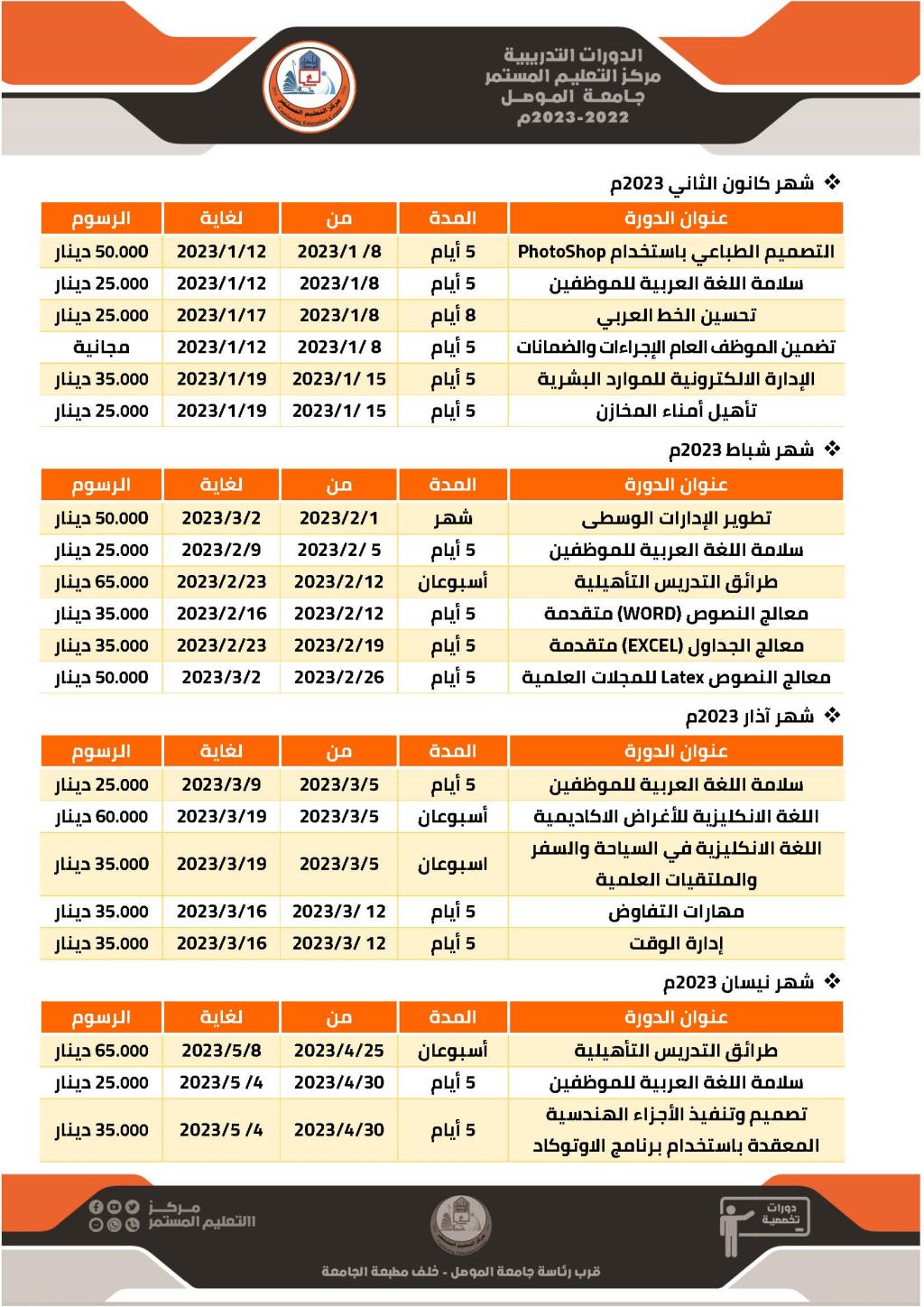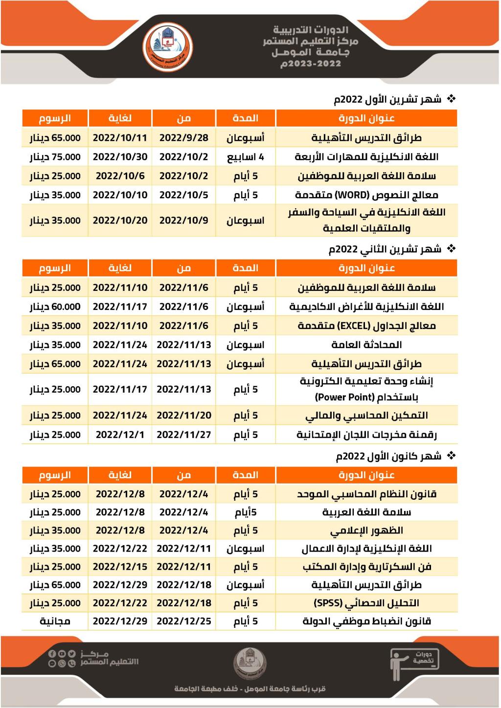 اصدرت إدارة مركز التعليم المستمر الدليل السنوي للدورات التي سيقيمها المركز للعام الدارسي 2022-2023، ولتخصصات مختلفة وكما موضحة في الدليل المرفق، مع ملاحظة ما يأتي: