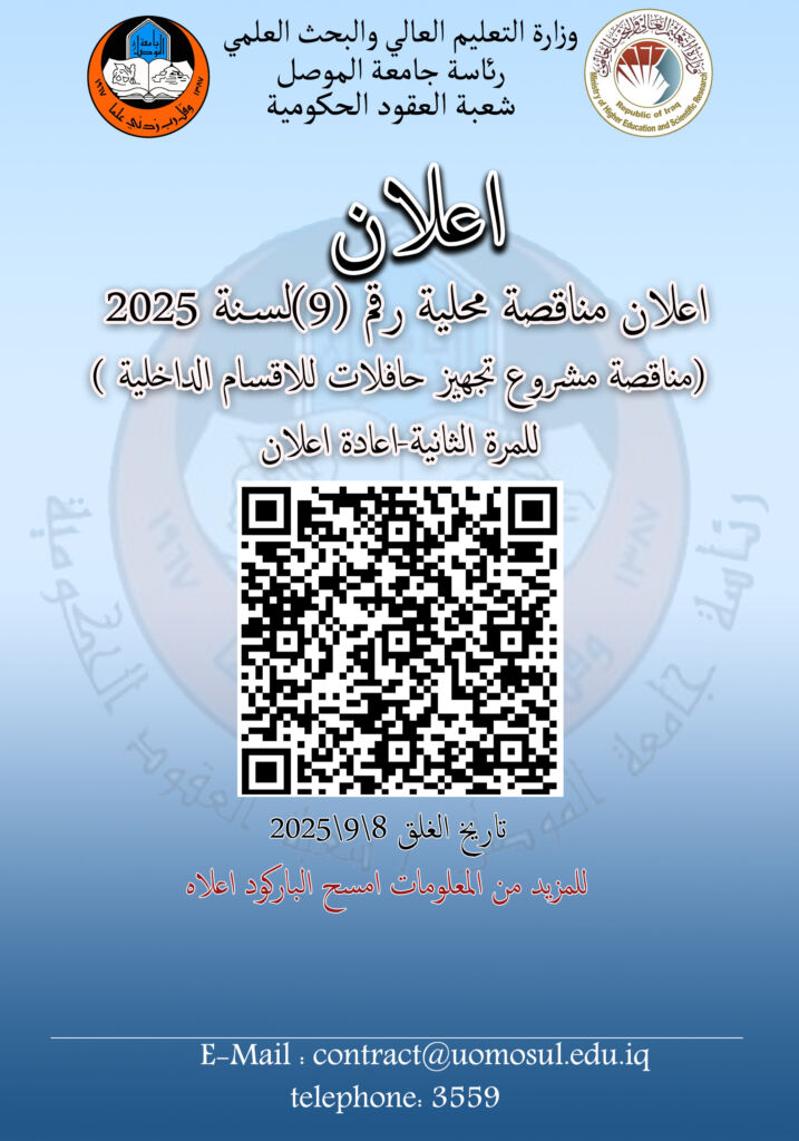 تعلن رئاسة جامعة الموصل/شعبة العقود الحكومية عن إعادة اعلان (للمرة الثانية) لإيجار المواقع المدرجة تفاصيلها في الجدول ادناه . ويكون موعد المزايدة في اليوم الخامس عشر من اليوم التالي لنشر الاعلان في تمام الساعة العاشرة صباحا في قاعة (الاجتماعات في قسم الاعمار والمشاريع) . فعلى الراغبين بالاشتراك بالمزايدة العلنية الحضور في الزمان والمكان المحددين اعلاه مستصحبين معهم مستمسكاتهم الرسمية مرفق معها التأمينات القانونية البالغة (20%) عشرين من المئة من القيمة التقديرية .