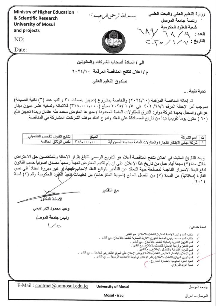 تعلن رئاسة جامعة الموصل/شعبة العقود الحكومية عن اجراء مزايدة علنية لإيجار المواقع المدرجة تفاصيلها في الرابط ادناه . ويكون موعد المزايدة في اليوم الثلاثين من اليوم التالي لنشر الاعلان في تمام الساعة العاشرة صباحا في قاعة (الاجتماعات في قسم الاعمار والمشاريع) . فعلى الراغبين بالاشتراك بالمزايدة العلنية الحضور في الزمان والمكان المحددين اعلاه مستصحبين معهم مستمسكاتهم الرسمية مرفق معها التأمينات القانونية البالغة (20%) عشرين من المئة من القيمة التقديرية .