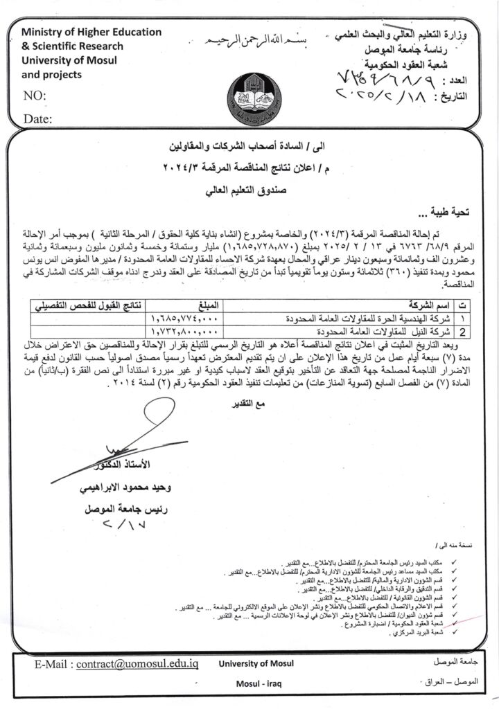 تعلن رئاسة جامعة الموصل/شعبة العقود الحكومية عن اجراء مزايدة علنية لإيجار المواقع المدرجة تفاصيلها في الرابط ادناه . ويكون موعد المزايدة في اليوم الثلاثين من اليوم التالي لنشر الاعلان في تمام الساعة العاشرة صباحا في قاعة (الاجتماعات في قسم الاعمار والمشاريع) . فعلى الراغبين بالاشتراك بالمزايدة العلنية الحضور في الزمان والمكان المحددين اعلاه مستصحبين معهم مستمسكاتهم الرسمية مرفق معها التأمينات القانونية البالغة (20%) عشرين من المئة من القيمة التقديرية .