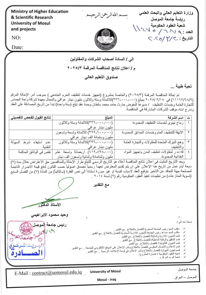 تعلن رئاسة جامعة الموصل / شعبة العقود الحكومية عن اجراء مزايدة علنية ( كسر قرار ) لإيجار موقع كشك كلية الطب رقم (۲) . ويكون موعد المزايدة في اليوم السابع من اليوم التالي لنشر الاعلان في تمام الساعة العاشرة صباحا على قاعة الاجتماعات في قسم الاعمار والمشاريع . فعلى الراغبين بالاشتراك بالمزايدة العلنية الحضور في الزمان والمكان المحددين اعلاه مستصحبين معهم مستمسكاتهم الرسمية مرفق معها التأمينات القانونية البالغة (۲۰) عشرين من المئة من القيمة التقديرية .