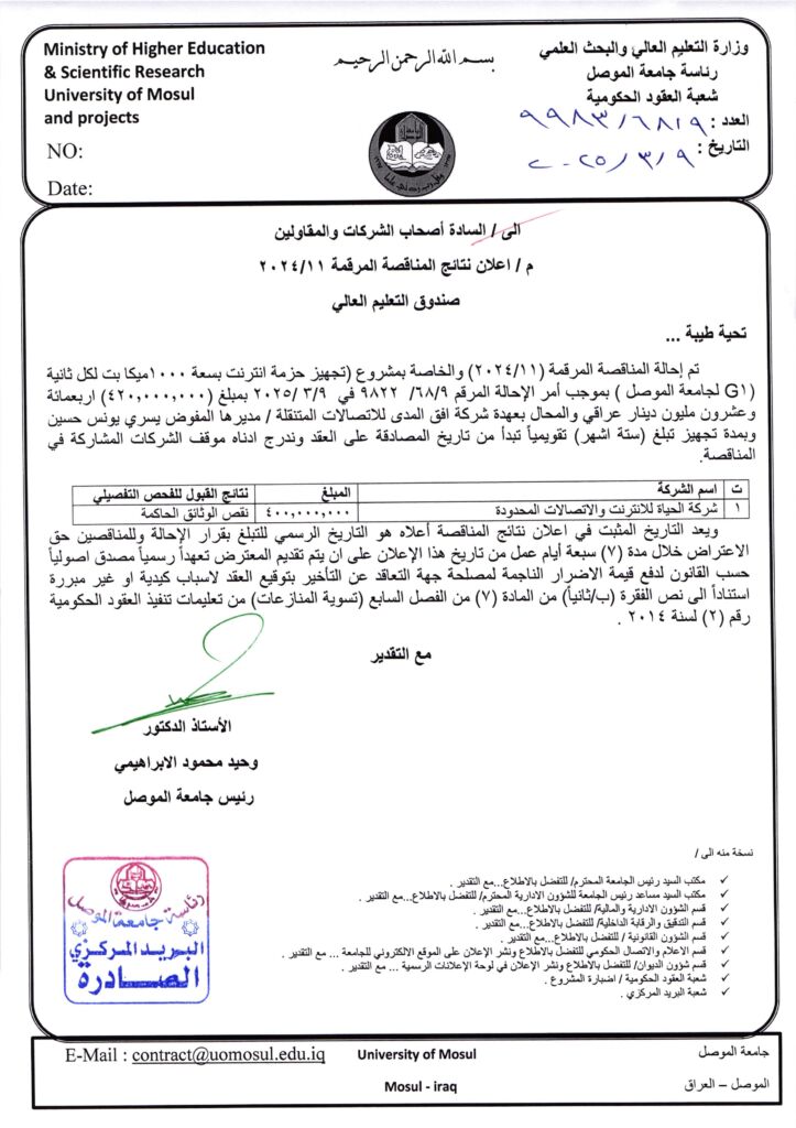 تعلن (رئاسة جامعة الموصل / شعبة العقود الحكومية) احدى تشكيلات وزارة التعليم العالي والبحث العلمي عن اجراء المناقصة العامة العلنية المرقمة 6/2025 عن [مشروع منظومة مصاعد لبناية كلية الإدارة والاقتصاد الجديدة /جامعة الموصل] بمدة تنفيذ قدرها (120) مائة وعشرون يوما والمبينة تفاصيلها وفقاً للوثائق القياسية لتنفيذ الاشغال الصغيرة ضمن مشاريع صندوق التعليم العالي لجامعة الموصل للعام 2025 ، فعلى الراغبين من الشركات المسجلة رسمياً داخل العراق ممن تتوفر فيهم الشروط المطلوبة من ذوي الخبرة والاختصاص تقديم عطاءاتهم وحسب الشروط والمواصفات التي يمكن الحصول عليها من رئاسة جامعة الموصل / شعبة العقود الحكومية الكائنة في المجموعة الثقافية وسيهمل اي عطاء غير مستوف للشروط المطلوبة وما تتطلبه الوثيقة القياسية بكافة اجزائها واقسامها او يرد بعد موعد غلق المناقصة للاطلاع على التفاصيل والشروط يرجى زيارة الرابط ادناه