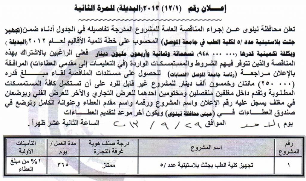 مشروع ( تجهيز جثث بلاستينية عدد / 5 لكلية الطب في جامعة الموصل ) المحسوب على خطة تنمية الاقاليم لعام 2012 ( البديلة )