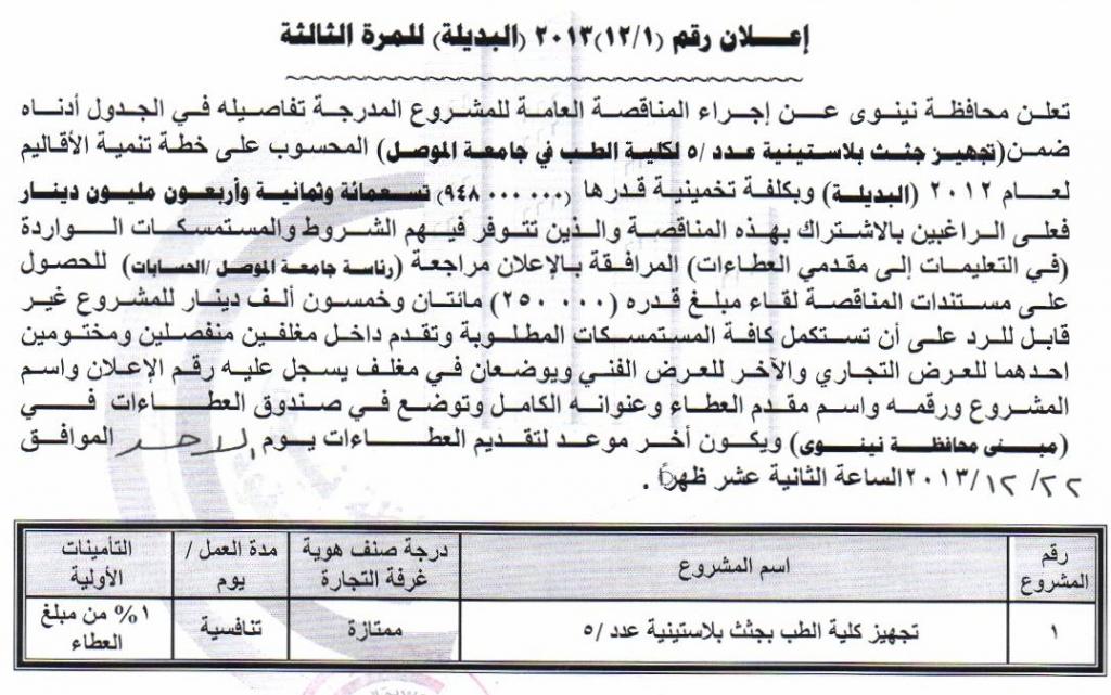 مشروع ( تجهيز جثث بلاستينية عدد / 5 لكلية الطب في جامعة الموصل ) المحسوب على خطة تنمية الاقاليم لعام 2012 ( البديلة ) اعلان للمرة الثالثة