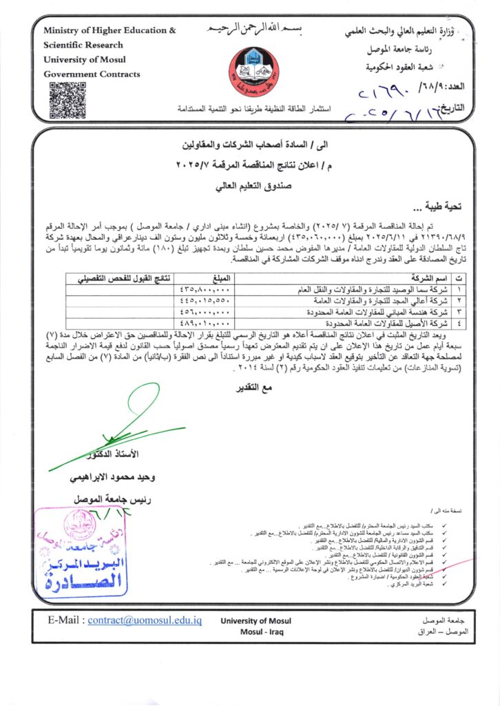 اعلان نتائج المناقصة المرقمة 7 لسنة 2025 صندوق التعليم العالي