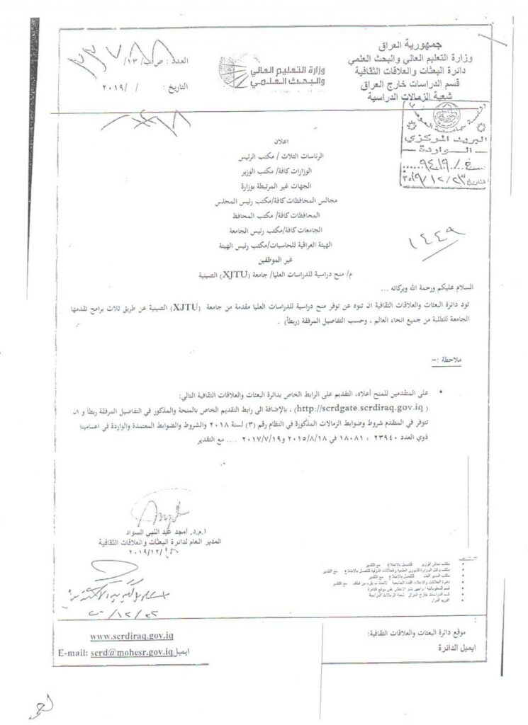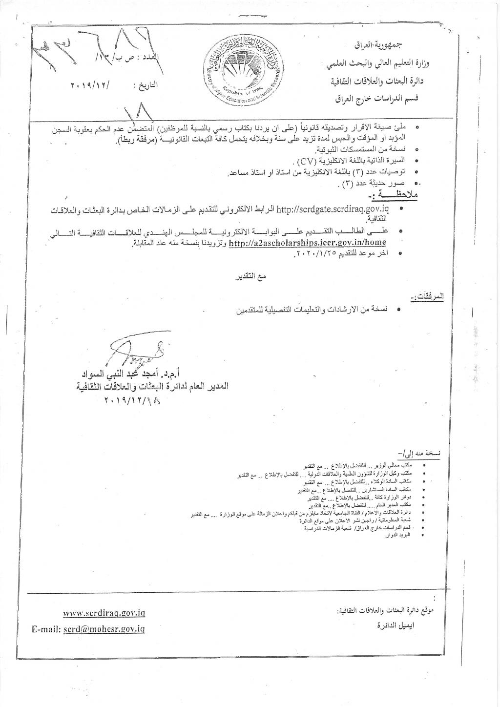 علماً ان اخر موعد للتقديم يوم 2020/1/25 وسيكون عبر الرابط الخاص لدائرة البعثات والعلاقات الثقافية http://scrdgate.scrdiraq.gov.iq .