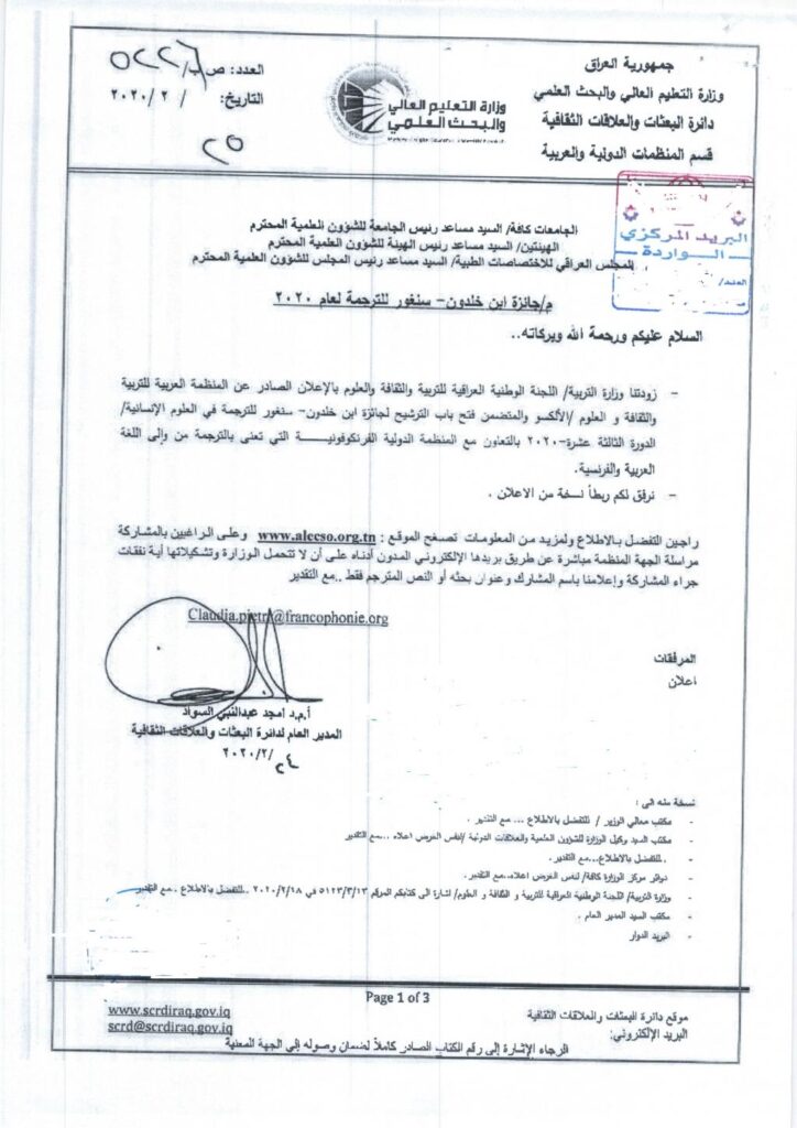 جائزة ابن خلدون - سنغور للترجمة لعام 2020