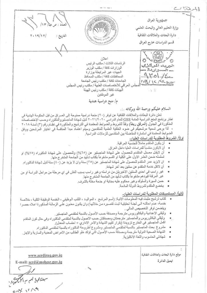 تعلن وزارة التعليم العالي والبحث العلمي عن توفرمنح دراسية للدراسات العليا مقدمة من جامعة (XJTU) الصينية، عن طريق ثلاث برامج تقدمها الجامعة للطلبة من جميع انحاء العالم وحسب التفاصيل المذكورة في كتاب الوزارة، وعلى الراغبين بالتقديم ومزيد من المعلومات الدخول على الرابط الخاص لدائرة البعثات والعلاقات الثقافية http://scrdgate.scrdiraq.gov.iq.