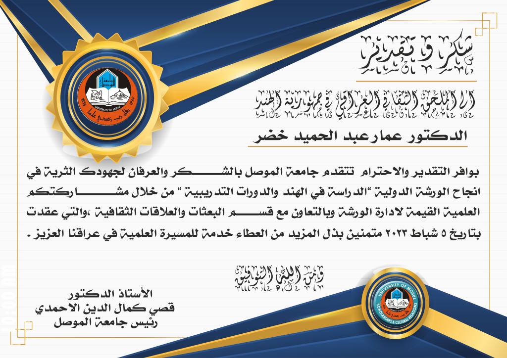 برعاية السيد رئيس جامعة الموصل الاستاذ الدكتور قصي كمال الدين الاحمدي المحترم و بالتنسيق مع الملحقية الثقافية للعراق في نيودلهي /جمهورية الهند ، اقام قسم البعثات و العلاقات الثقافية / شعبة العلاقات الثقافية ورشة عمل دولية عن الدراسة في الهند والدورات التدريبية المجانية للمنتسبين ، وادار الورشة الملحق الثقافي للعراق في الهند (الدكتور عمار عبدالحميد خضر) وتضمنت الورشة التركيز على الدورات التدريبية المجانية (بضمنها أجور السفر المدفوعة) والتخصصات المختلفة التي تغطيها وزارة الخارجية الهندية ،وذلك في تمام الساعة العاشرة من صباح يوم الاحد المصادف 5 شباط 2023 وعلى قاعة المسرح الطلابي في المركز الطلابي لجامعة الموصل وحضر الورشة العديد من المنتسبين (تدريسيين وموظفين) وطلبة الدراسات العليا والدراسات الأولية ، وتم تقديم شهادية تقديرية من قبل جامعة الموصل الى د. عمار عبدالحميد لدوره المتميز والمثابر لانجاح الورشة واغناء جامعة الموصل بالمنح والدورات التدريبية التي تطرحها جمهورية الهند للعراق ..ومن الله التوفيقوفي المرفق رابط المحاضرة وعن المعيشة في الهند وبرامج المنح والتدريب المتوفرةhttps://youtu.be/VUk5E8Kq9yAhttps://youtu.be/QW7W4nRxKxc