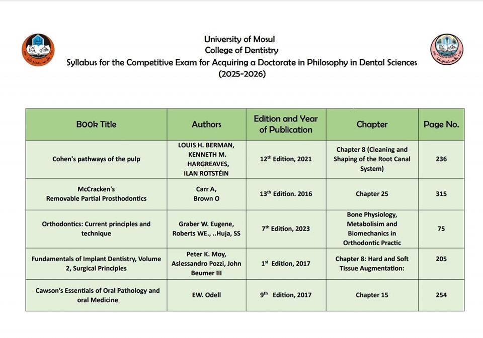 تعلن جامعة الموصل /كلية طب الأسنان /شعبة شؤون الدراسات العليا عن مواد الامتحان التنافسي لتخصصات الماجستير في علاج الأسنان التحفظي، تقويم الأسنان، جراحة الفم، صناعة [إقرأ المزيد]