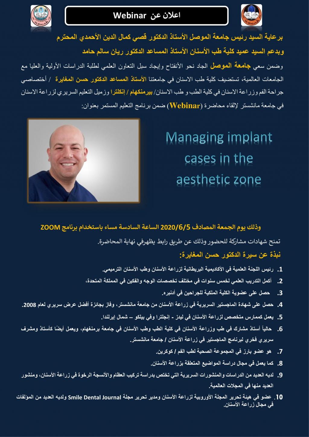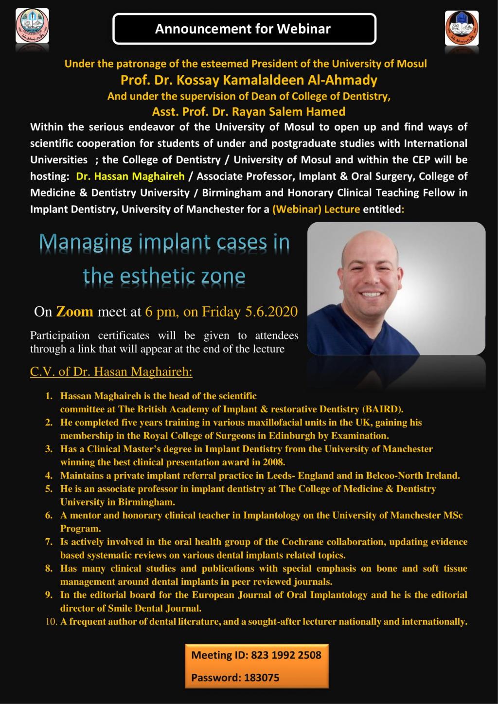 College of Dentistry / University of Mosul is inviting you to a scheduled Zoom meeting.Topic: Managing implant cases in the aesthetic zone