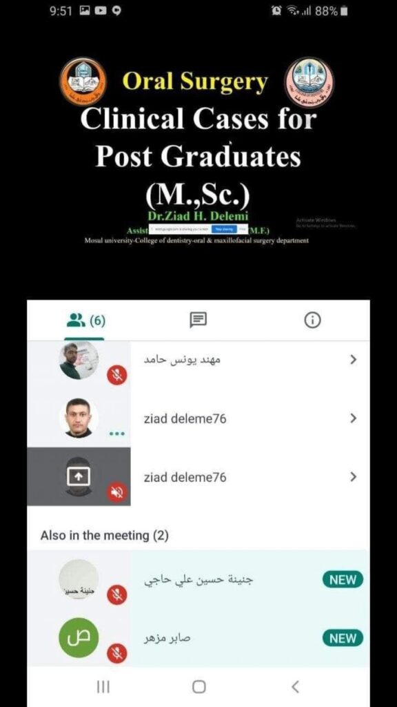 بإشراف السيد رئيس فرع جراحة الفم و الوجه والفكين د. عبد الحميد ناطق الدباغ ، حضر أعضاء الأسرة التدريسية في الفرع يوم الجمعة ٢٩/ آيار /٢٠٢٠ لقاءً نقاشياً و تدريبياً بشأن استخدام وسائل التعليم الإلكتروني في الاختبارات. و عرض السادة التدريسيون نماذج من طرق وضع الأسئلة و ما قد يواجه الممتحن من عقبات تقنية أثناء ذلك. هذه الجهود ترمي إلى الاستفادة من جميع ما يوفره التعليم الإلكتروني من إمكانات حتى بعد انتهاء جائحة كورونا عن العالم بإذن الله.