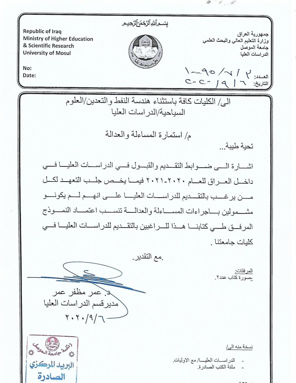أعلان الى كافة المتقدمين للدراسات العليا للعام الدراسي 2020-2021