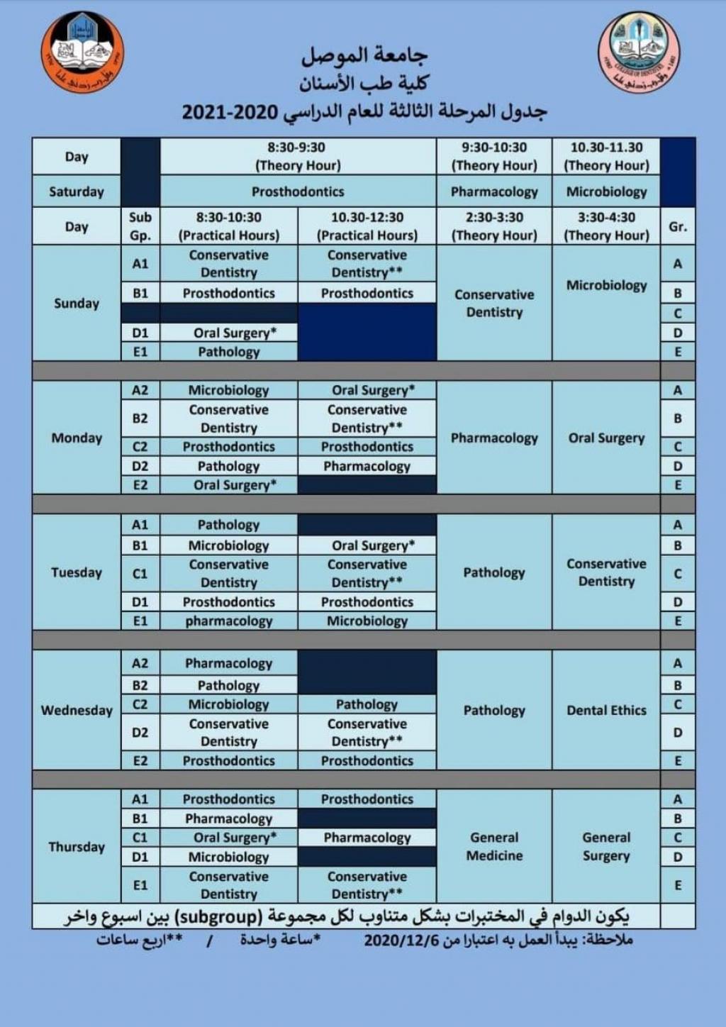 تم تغيير موعد المحاضرات النظرية لتبدا الساعة ٢.٣٠ ظهرا بدلا من ١.٣٠ ظهرا مراعاةً لظروف الطلبة و لتهيئة الوقت الكافي لحضور المحاضرات الإلكترونية ، و كما موضح في الجداول المرفقة. مع تمنياتنا لكم بالموفقية و النجاح.