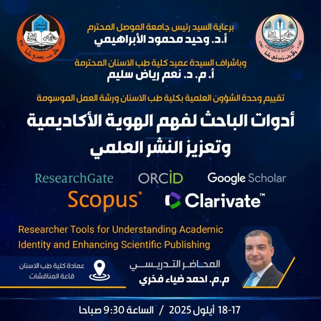 تقيم وحدة التأهيل والتوظيف والمتابعة في كلية طب الأسنان وضمن برنامج التعاون مع نقابة أطباء الأسنان/ فرع نينوى ورشة عمل لأطباء الأسنان/ خريجي ٢٠٢٤-٢٠٢٥ بعنوان (المهارات العملية لطبيب الأسنان بعد التخرج) تتناول في هذا الجزء محوري العازل المطاطي والتصوير الفوتوغرافي في طب الأسنان، يلقيها كل من المدرس الدكتور زكريا فارس الحاج أحمد وطبيب الأسنان الاختصاص بسام طلال اللويزي.. وذلك في إطار تنفيذ الاستراتيجية الوطنية للتربية والتعليم/ محور تطوير المهارات التخصصية، يوم غد الأربعاء ١٧ أيلول ٢٠٢٥ في مختبر الفانتوم بعد الساعة العاشرة.