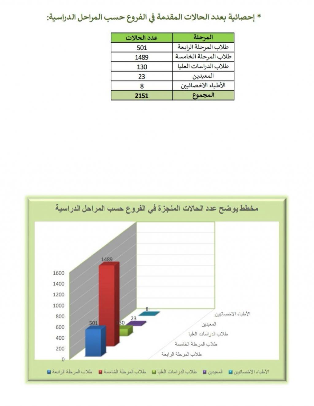 إضافة الى ذلك، فقد بينت الاحصائيات الاعداد التفصيلية لمختلف أنواع العلاجات المقدمة من قبل المستشفى التعليمي، وقارنت بين انجاز طلبة المراحل الرابعة والخامسة والدراسات العليا لهذه العلاجات …(إعلام كلية طب الأسنان)