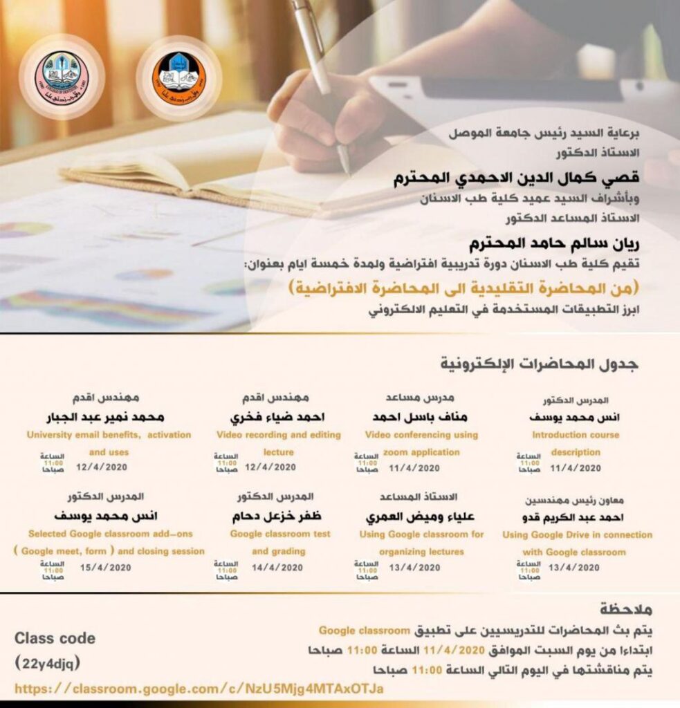 برعاية السيد رئيس جامعة الموصل المحترم أ. د. قصي كمال الدين الأحمدي و بدعم من عمادة كلية طب الأسنان ، تقيم كلية طب الأسنان معرضها الفني الثاني على صفحة الفيسبوك مصحوباً بمسابقة فنية للأعمال المشاركة و تحت عنوان ( #الفن_يتحدى٢_إنعكاسات_كورونا).. و ذلك ابتداءً من الخميس ٩ نيسان. و يشمل المعرض أعمالاً فنية و أدبية تحاكي الواقع الذي يمر به العالم أجمع و بلدنا الحبيب.