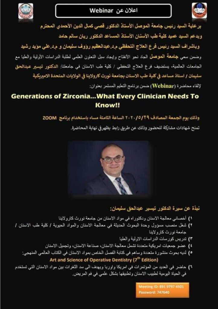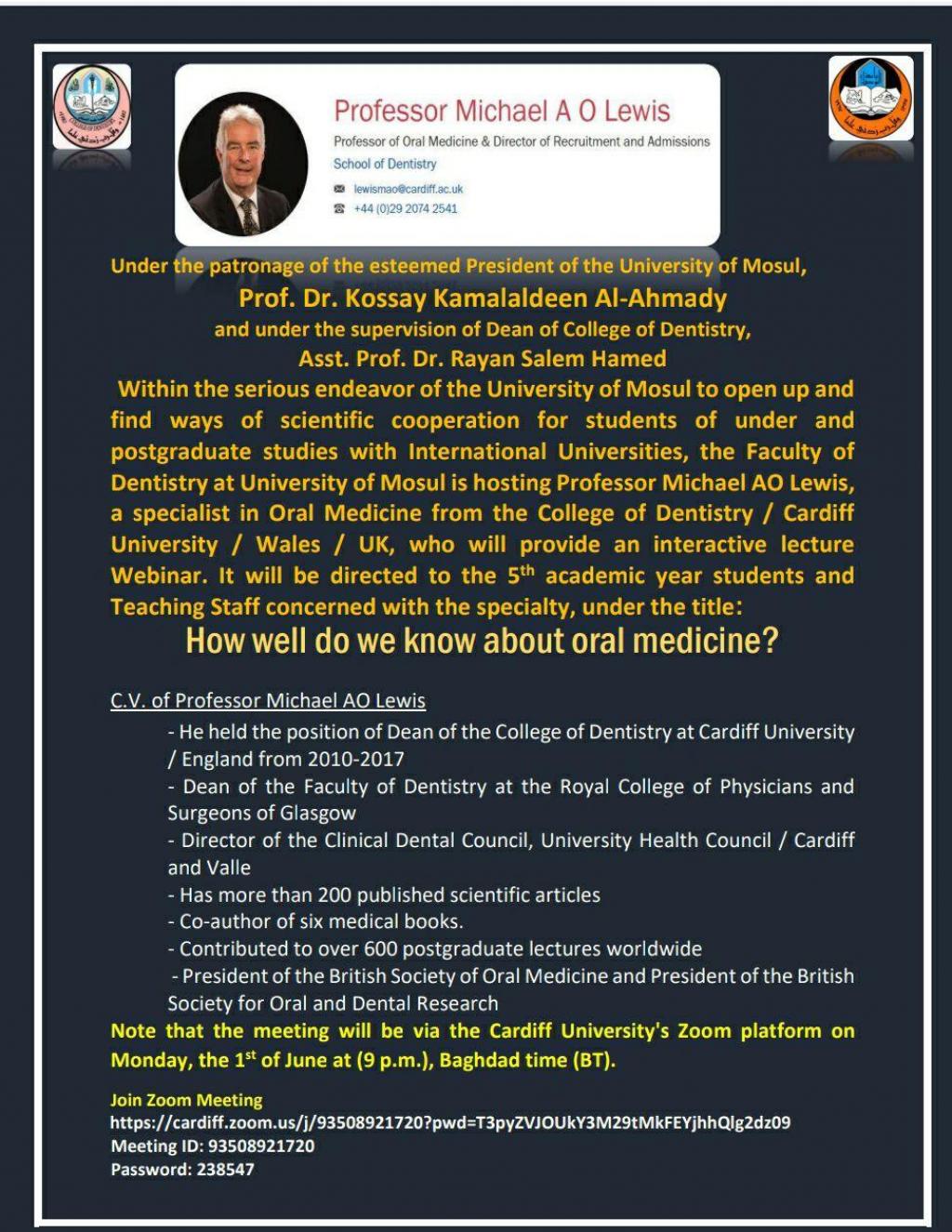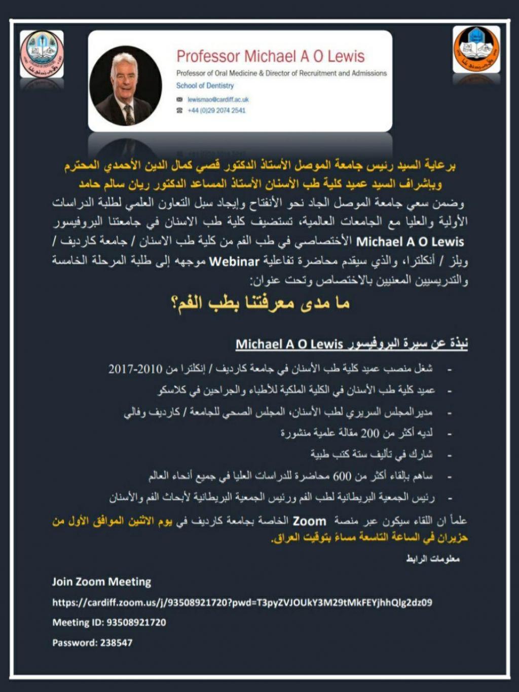 برعاية السيد رئيس جامعة الموصل المحترم أ. د. قصي كمال الدين الأحمدي و بإشراف عميد كلية طب الأسنان المحترم أ. م. د. ريان سالم حامد ، تستضيف كلية طب الأسنان البروفيسور ميشيل لويس/ اختصاص طب الفم/ كارديف- ويلز، محاضرة تفاعلية (ويبينار) تحت عنوان: (ما مدى معرفتنا بطب الفم؟) و ذلك على برنامج الزوم، يوم ١ حزيران ٢٠٢٠ ، و هي مخصصة لطلبة كلية طب الأسنان من المرحلة الخامسة و الأخصائيين المهتمين بالموضوع.