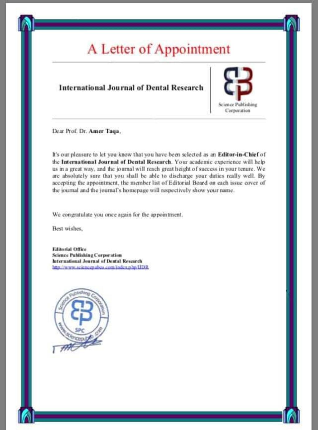 اختيار الاستاذ الدكتور عامر عبدالرحمن طاقة رئيساً لتحرير المجلة الدولية لبحوث طب الاسنان .