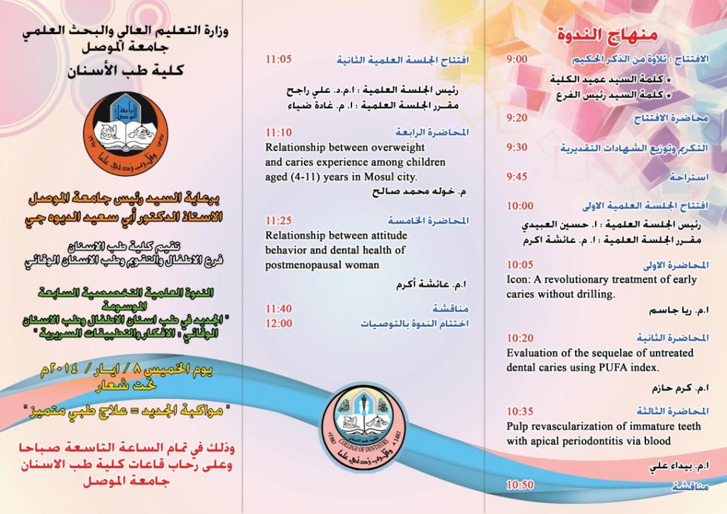 تقيم كلية طب الاسنان فرع الاطفال والتقويم وطب الاسنان الوقائي الندوة العلمية التخصصية السابعة الموسومةالجديد في طب اسنان الاطفال وطب الاسنان الوقائي : الافكار والتطبيقات السريريةيوم الخميس 8-5-2014 وذلك في تمام الساعة التاسعة صباحا وعلى رحاب قاعات كلية طب الاسنان