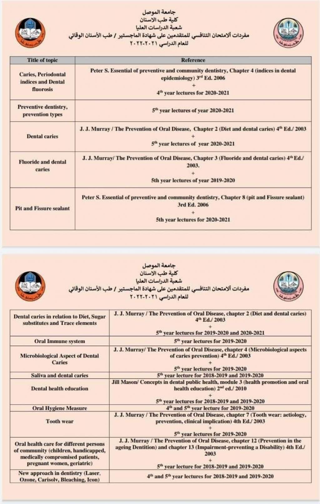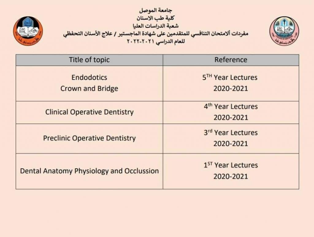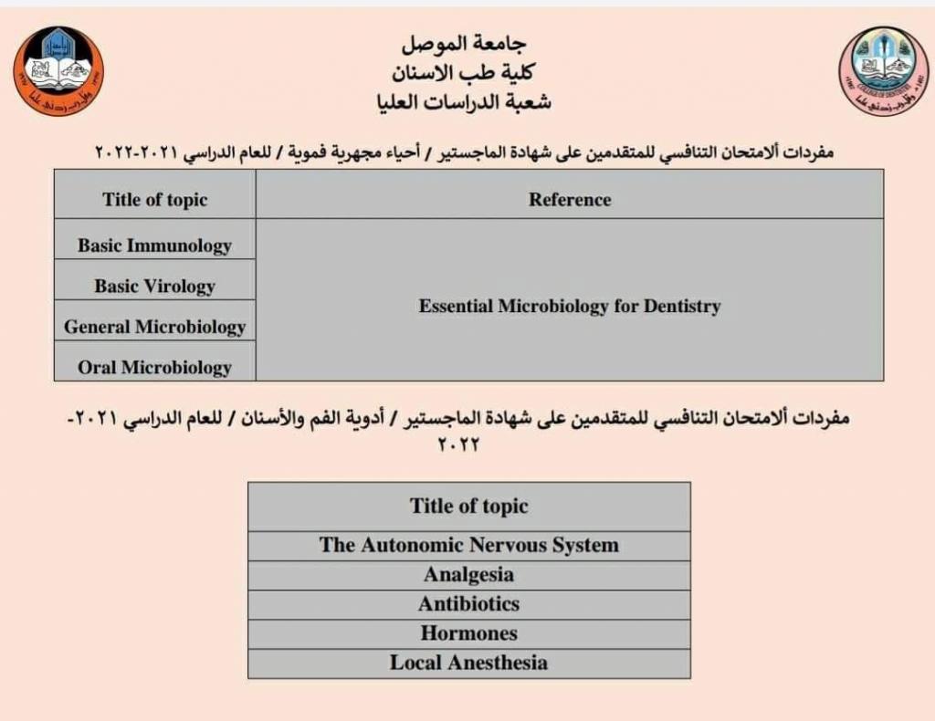 الى الراغبين للتقديم للدراسات العليا. نود اعلامكم بأن التخصصات المفتوحة لدراسة شهادة الماجستير في كلية طب الاسنان للعام الدراسي ٢٠٢١-٢٠٢٢ هي كالتالي:١. ماجستير في جراحة الفم والوجه والفكين