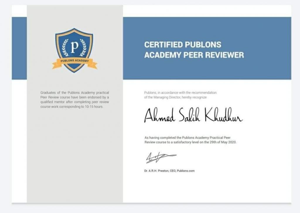 التدريسي في فرع جراحة الفم و الوجه والفكين م. د. أحمد صالح خضر يحصل على شهادة من مؤسسة publons العالمية