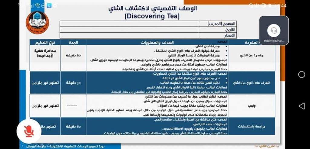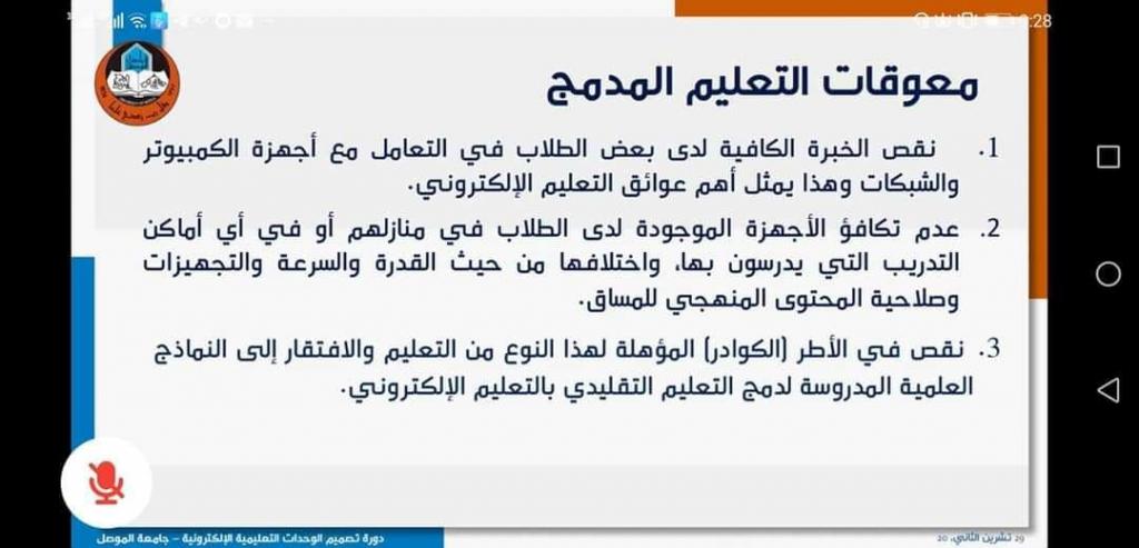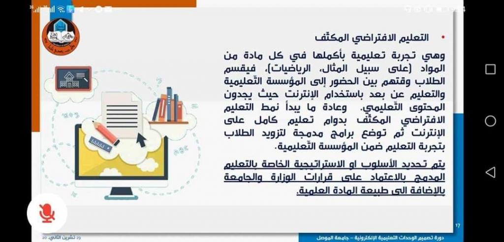 والتزاماً بتوجيهات رئاسة جامعة الموصل في إقامة محاضرات للكادر التدريسي كافة عن التعليم الإلكتروني، انطلقت مساء يوم الأحد الموافق ٢٩/ تشرين الثاني /٢٠٢٠ دوره إعداد وتصميم المحتوى العلمي الرقمي من تقديم م. د. ظفر خزعل الميلا و إعداد مركز الحاسبة الإلكترونية في جامعة الموصل. وأعطيت المحاضرة على منصة FCC حيث شهدت حضور جميع الكادر التدريسي في كلية طب الأسنان . و ستستمر المحاضرات لغاية يوم ٣/ تشرين الثاني /٢٠٢٠ وستختتم الدورة باختبار للحصول على شهادة اجتياز الدورة .