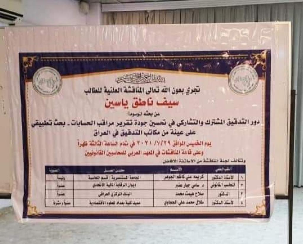 تبارك عمادة كلية طب الأسنان للسيد سيف ناطق ياسين مسؤول شعبة الحسابات في الكلية بمناسبة حصوله على شهادة المحاسبة القانونية، حيث أجريت المناقشة يوم الخميس الموافق ٢٩/ ٧/ ٢٠٢١ في المعهد العربي للمحاسبين القانونيين في بغداد.