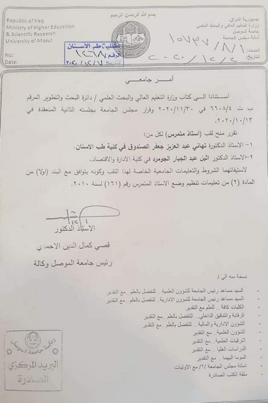 يتقدم السيد عميد كلية طب الأسنان الأستاذ المساعد الدكتور ريان سالم حامد و نيابة عن تدريسيي و منتسبي الكلية بأحر التهاني وأصدق التبريكات لعَلَم الكلية الكبير أ. د. تهاني عبد العزيز جعفر الصندوق بمناسبة حصولها على لقب الأستاذ المتمرس بعد أن أُحيلت على التقاعد، تثميناً لجهودها المبذولة سابقاً في كليتنا. سائلا الله العلي القدير لها بالتوفيق والسداد و بمزيد من الإزدهار في عملها خدمة لجامعتنا ولكليتنا. ومن الله التوفيق.