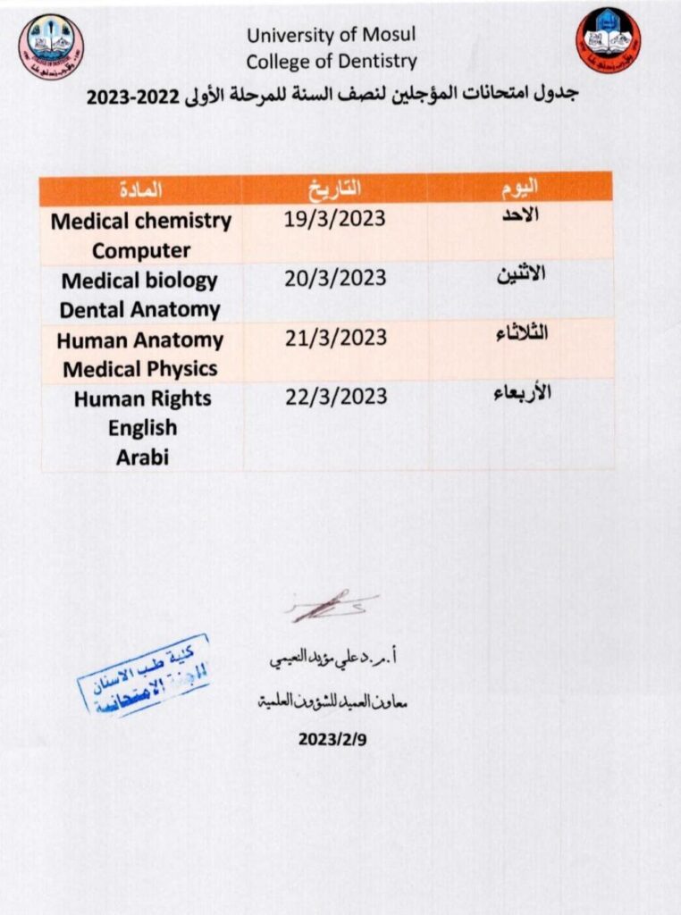 جدول امتحانات المؤجلين لنصف السنة للمرحلة الأولى 2022_2023