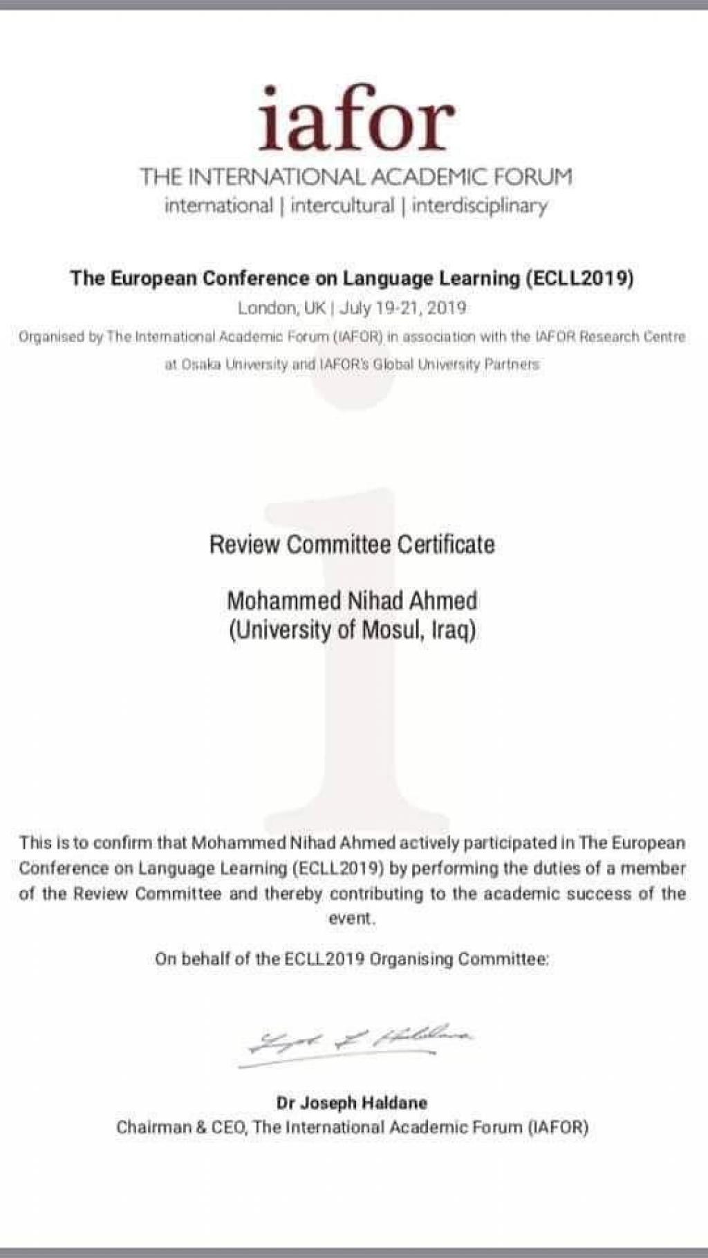 حصل الأستاذ المساعد الدكتور محمد نهاد على شهادة العضوية في اللجنة العلمية المحكمة للمؤتمر الأوربي لتعليم اللغة