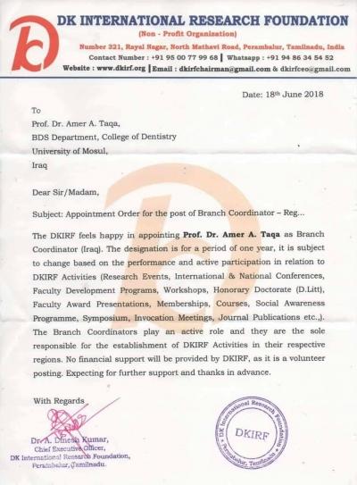 حصل الأستاذ الدكتور عامر عبدالرحمن طاقة على منصب المنسق الفرعي للمؤسسة الدولية للبحث العلمي(DKirF) ومقرها الهند ممثلا عن جمهورية العراق وقد عبر رئيس المؤسسة التنفيذي الأستاذ الدكتور دانش كومار عن سعادته لترشيح الدكتور عامر طاقة لهذا المنصب نظراً لأدائه المتميز ومشاركاته الفعالة فيما يخص بنشاطات المؤسسة.