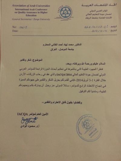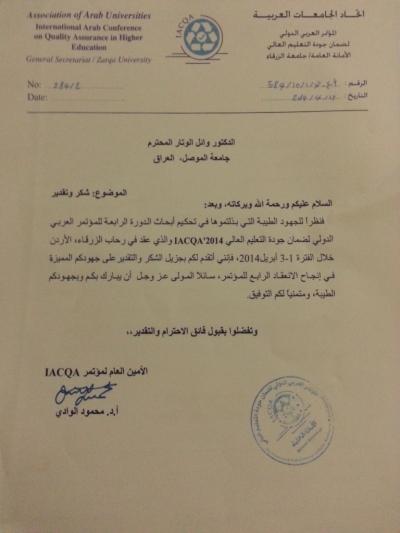حصل كل من الاستاذ المساعد وائل طليع الوتار معاون العميد للشؤون العلمية والاستاذ المساعد محمد نهاد على شكر وتقدير من اتحاد الجامعات العربية المؤتمر العربي الدولي لضمان جودة التعليم العالي الامانة العامة وذلك للجهود المبذولة من قبلهما في تحكيم ابحاث الدورة الرابعة للمؤتمر العربي الدولي لضمان جودة التعليم العالي IACQA 2014 الذي عقد في الاردن خلال الفترة 1-3 ابريل 2014