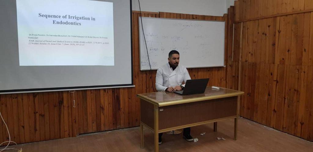 عقد يوم الاربعاء الموافق ٢.١٩/١٢/٤ الحلقة النقاشية لفرع العلاج التحفظي القاها المدرس مساعد مناف باسل احمد تحت عنوان (sequence of irrigation in endodontic treatment) في قاعة المناقشات وحضرها جمع كبير من تدريسيي القسم وطلبة الدراسات العليا.